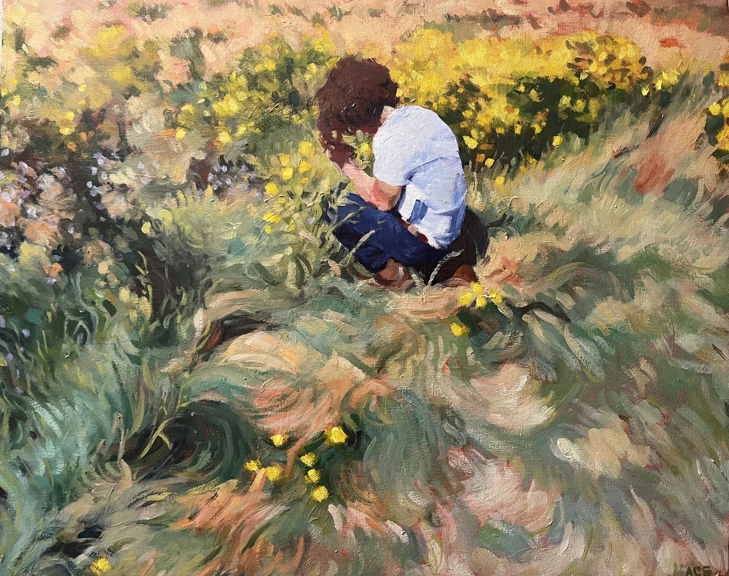 Questen kneeling in the grass with his nature ID book.